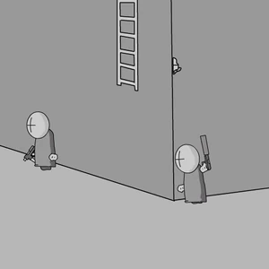 Two grunts jump onto the elevator and try to take out Hank, the second grunt cuts a hole into the roof of the elevator so that the first grunt can fire at Hank. Hank shoots at the grunt, who ends up missing and killing the grunt with the plasma cutter. A third grunt jumps onto the elevator, and throws in a frag grenade, only for the grenade to be returned to the grunts, which kills them. Two more grunts jump onto and into the elevator as well, and killed just as easily as the preceding three. Hank jumps onto the roof of the elevator to avoid the gunfire from several grunts outside of the elevator. They then enter the elevator and Hank kills one of the grunts inside and then shoots the cables, killing those inside the elevator. Hank then climbs the broken cable and making his way through multiple rooms on a higher floor, Hank slays every grunt to stand in his way. Instead of murdering the last one, Hank disarms and interrogates him to find the Sheriff before knocking him out.