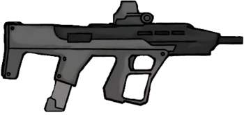The High Tower Armory MBS 95, a bullpup conversion of the Hi-Point Carbine, appears with a full-auto conversion in Madness Combat 11: Expurgation, wielded by a Tricky skeleton and then by Sanford. On his curiouscat.me page, Krinkels all but confirmed that the weapon was chambered in the powerful 10mm Auto cartridge.