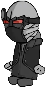 "2BDamned", or "Doc", is the tetartagonist of the Madness Combat series. He helps Deimos escape from Purgatory during the events of DedmosRebuilt.fla. "2BDamned" is derived from his username on the instant message console he uses to communicate with FellowD9 in this episode.