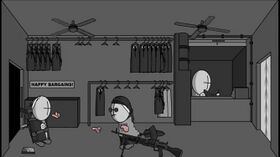 Deimos first tries a l33t agent suit, which Sanford rejects. Deimos proceeds to dig through the bargain bin and finds a pair of circular shades and tries them before handing them to Sanford. As Sanford tries on the circular shades, Deimos thinks they look great, and finds a mirror in the bargain bin for Sanford to look at himself. Sanford looks in the mirror and extends his lower lip, giving him his trademark confident lip. Deimos finds a shirt in the bargain bin, and insists having Sanford wear them. Meanwhile, a group of A.A.H.W. members meet outside the door. An A.T.P. engineer orders an agent to plant a bomb onto the door, ready to ambush the two protagonists.