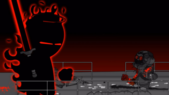 The Auditor then moves over the other side and absorbs the dead agents, growing even bigger. He throws another shadow beam at Hank, who dodges, then moves forward and punches him a few more times. The Auditor absorbs the Mag Agent: V4 and brings out his (now much larger) shadow sword. He attempts to slash Hank, but is blocked by Hank's lightning-charged fist. The Auditor finally decides to absorbs the agents all the way down on the ground near the tower. After absorbing them, he absorbs the dead Agents at the infamous venue from the end of Madness Combat 7: Consternation, where Hank last died, along with the dangerous Tricky. An 'OH GOD NO' message with some scrolling text underneath appears, repeating the following text: